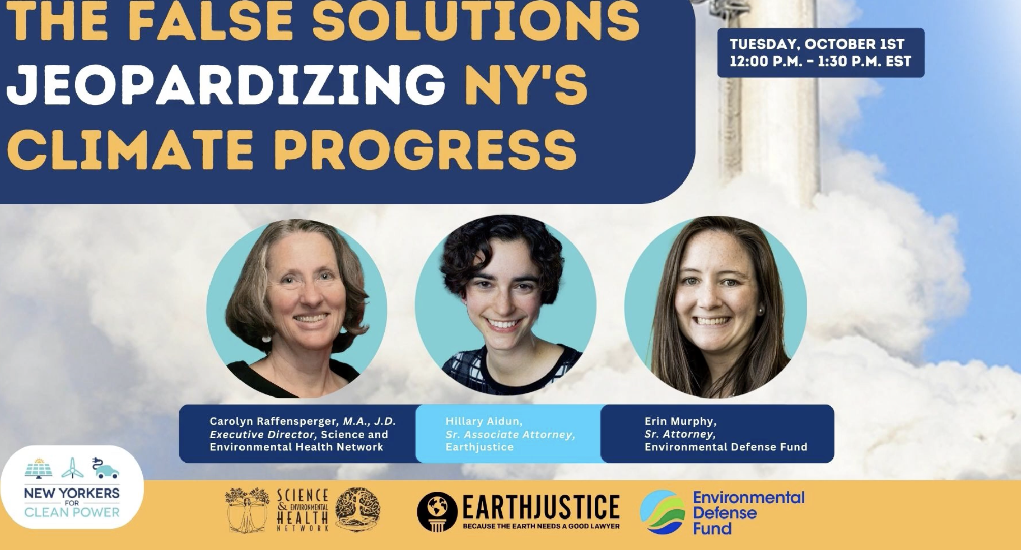 New York has set an ambitious climate plan to reduce greenhouse gas emissions, but false solutions threaten to derail progress. This teach-in examines three problematic solutions: so-called "renewable natural gas," hydrogen blending for buildings, and carbon capture and storage, all of which could impede real climate action. Guest Speakers: Hillary Aidun, Earthjustice; Erin Murphy, Environmental Defense Fund; Carolyn Raffensperger, The Science and Environmental Health Network.